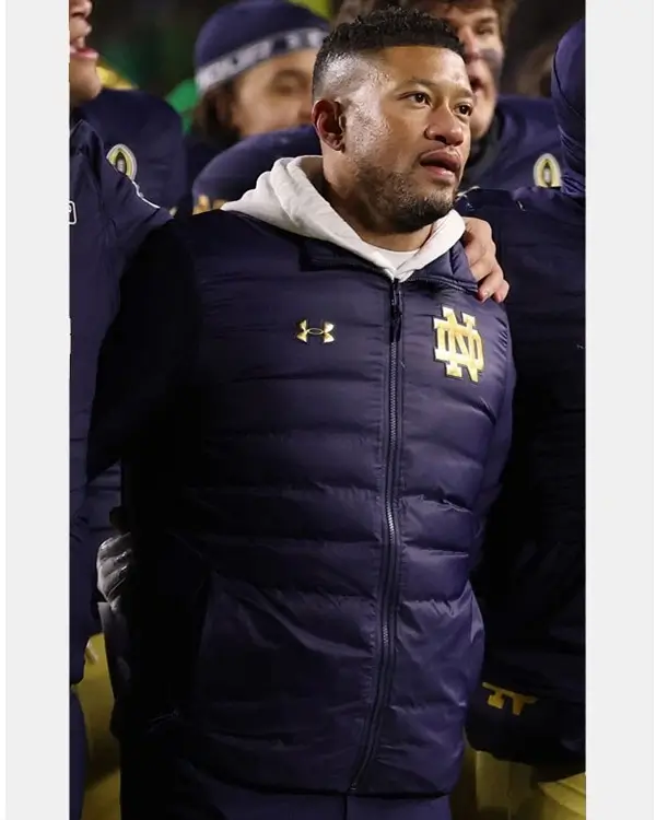 Marcus Freeman, head coach of the Notre Dame Fighting Irish football team, is known for his distinctive sideline style during the colder football seasons. One standout piece is his navy blue puffer jacket, which combines practicality with team pride and is a staple in his fall and winter game wardrobe.