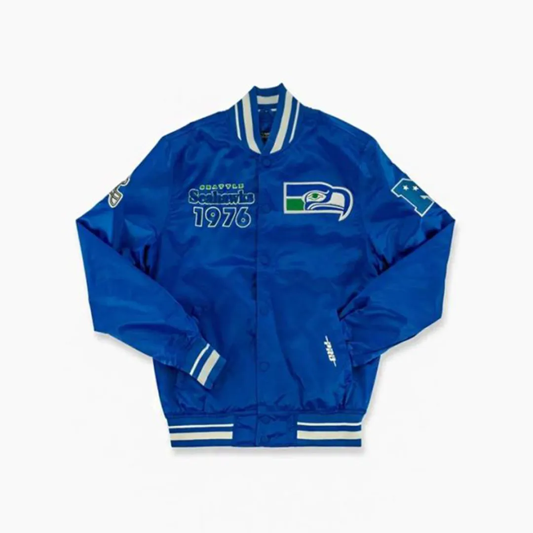 Made with premium-quality materials, this varsity jacket is both durable and comfortable. The vibrant blue color, complemented by the iconic Seahawks logo and retro 1976 design, makes it a standout piece. It’s perfect for game days, casual outings, or just showing off your Seahawks spirit wherever you go. With its classic varsity jacket style, including ribbed cuffs, a button-up front, and a comfortable fit, this piece is as functional as it is stylish. Pair it with jeans and sneakers for a relaxed look, or throw it on over a hoodie for extra warmth on colder days.
