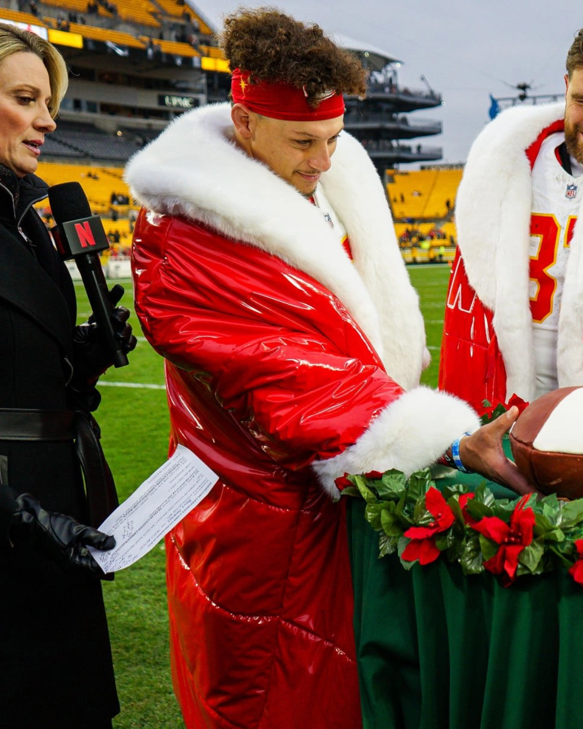Travis Kelce’s red Christmas coat is a classic piece that he wore during the 2023 holiday season. This fit stands out with its festive design and high-end tailoring, offering a mix of classic style and a playful holiday spirit. He worn it during a high-profile appearance at the 2023 Chiefs’ holiday party. He was spotted wearing it while attending the event with teammates and friends, adding a festive touch to the occasion. The fit drew attention due to its bright red color.